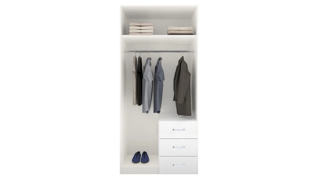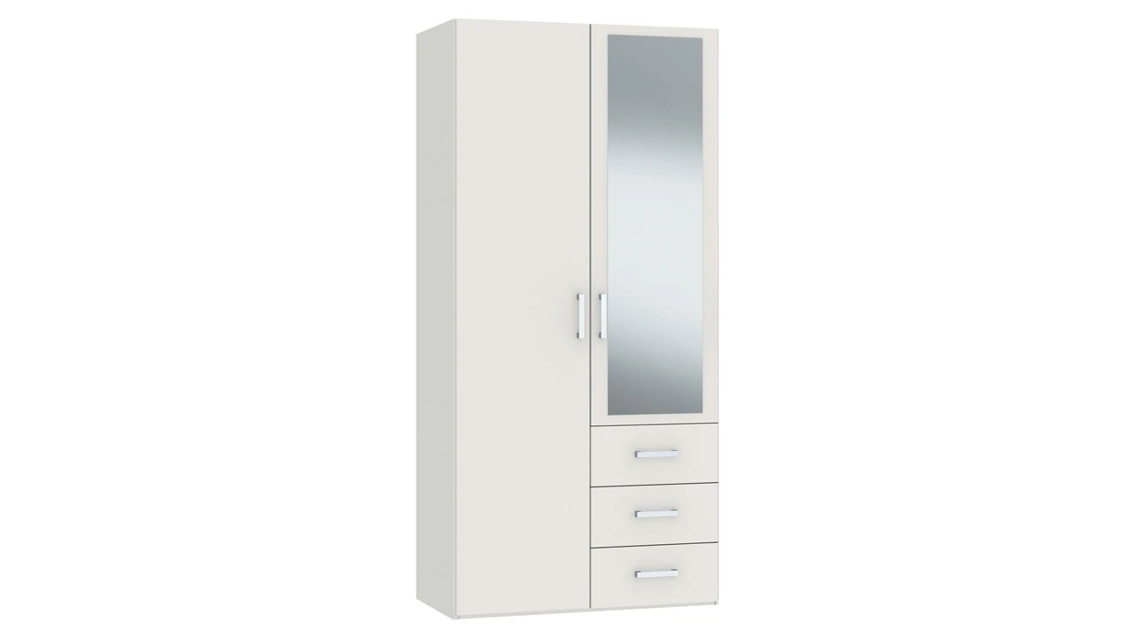 De draaideurkast heeft twee deuren met 1 spiegel en 3 lades. De binnenkant van de kledingkast bestaat uit 1 legplank en 1 roede over de volle breedte, en is uit te breiden met extra legplanken. De kledingkast is verkrijgbaar in diverse kleuren รฉn afmetingen.