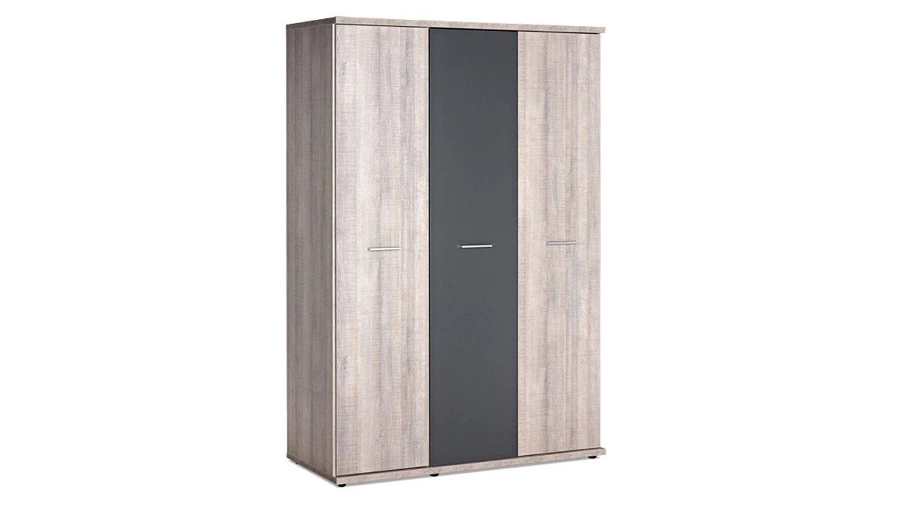 De kast is gemaakt van spaanplaat melamine. De kast heeft drie draaideuren. In ieder kastgedeelte zit een legplank en een roede. Genoeg opbergruimte dus.