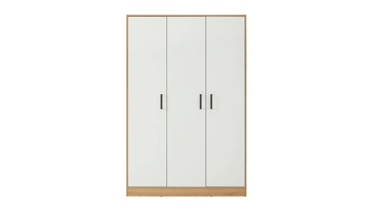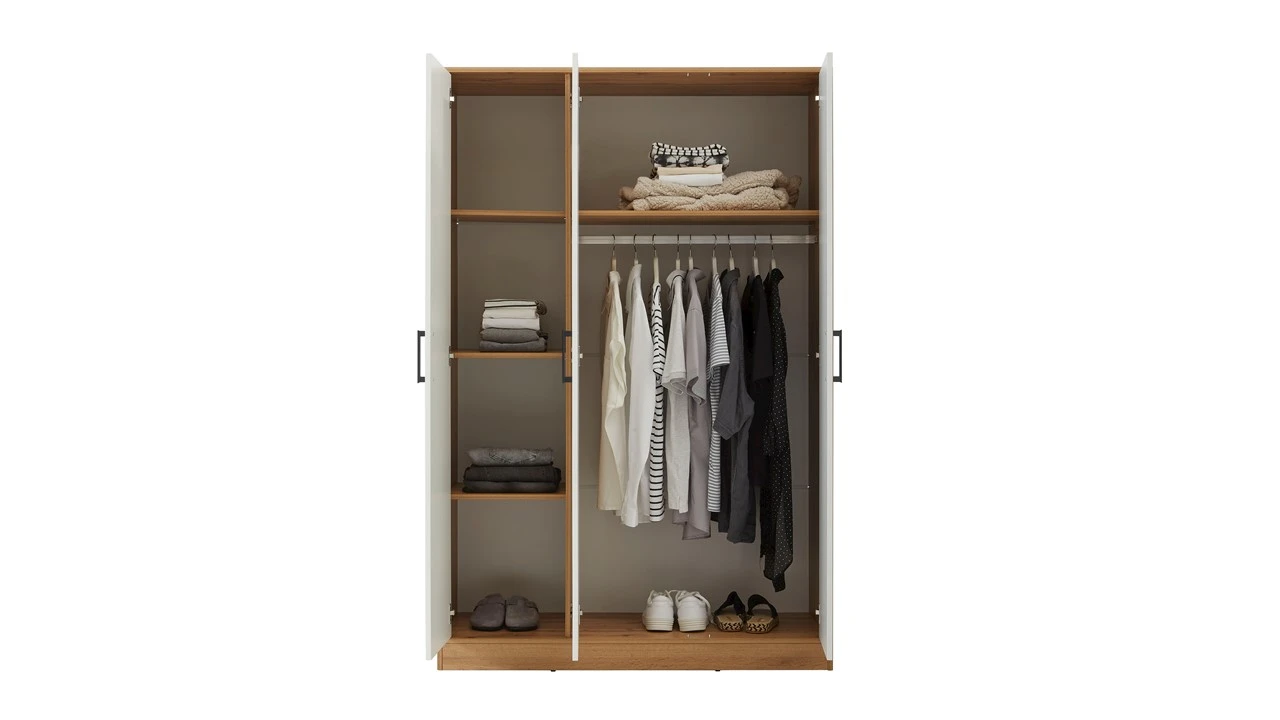 De kast is gemaakt van gefineerd spaanplaat met een eikenhouten opdruk. De kast heeft drie draaideuren. In รฉรฉn kastgedeelte zit een breed hanggedeelte met hierboven een legplank en in het andere smallere kastgedeelte zitten drie legplanken. Genoeg opbergruimte dus.