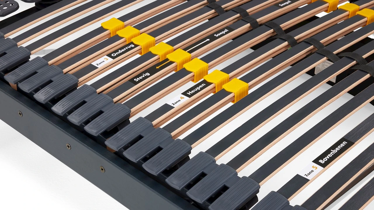 Bepaal dankzij een eenvoudig schuifmechanisme heel gemakkelijk waar je extra veerkracht en ondersteuning bij je heupen en schouder kunt gebruiken. Door de extra kunststof schotel biedt deze lattenbodem extra comfort bij de schouders. De latten zitten in een duurzaam rubberen houder. Doordat de latten veren, bieden zij je optimaal ligcomfort. Daarnaast liggen de latten kort op elkaar, hierdoor is deze lattenbodem ook erg geschikt voor pocketveermatrassen. Zijn deze tussenruimtes te groot dan krijgt een pocketveermatras namelijk niet voldoende ondersteuning en kunnen de veren door de afdeklaag komen. De bodem is geschikt voor personen met een gewicht tot 120 kilo.