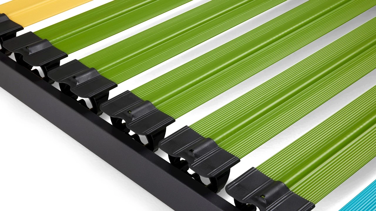 De lattenbodem koop je altijd met een standaardindeling ‘Medium’ die gemaakt is van gele, blauwe en groene latten. Door de gekleurde latten in een andere kleur volgorde in elkaar te klikken, pas je het comfort van de bodem heel eenvoudig zelf en zonder gereedschap aan. Houd je van stevige ondersteuning, dan kies je bijvoorbeeld voor de blauwe latten in het midden, de gele onderin en de groene bovenin. Ideaal!